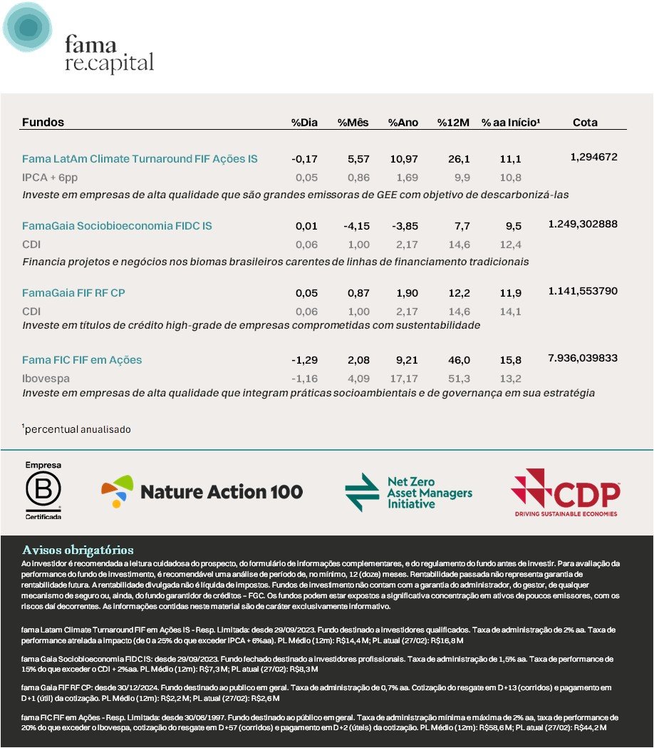 As informações contidas no site são de caráter exclusivamente informativo. É fundamental a leitura do regulamento dos fundos antes de qualquer decisão de investimento. Rentabilidade passada não é garantia de rentabilidade futura. A rentabilidade divulgada não é líquida de impostos. Nenhum fundo conta com garantia da instituição administradora, da gestora ou do Fundo Garantidor de Créditos - FGC. Para obtenção do Regulamento, Histórico de Performance, Prospecto, além de eventuais informações adicionais, favor entrar em contato com a fama re.capital ou com a Administradora do fundo. Para avaliação de performance dos fundos de investimento, é recomendável uma análise de período de, no mínimo, 12 meses.